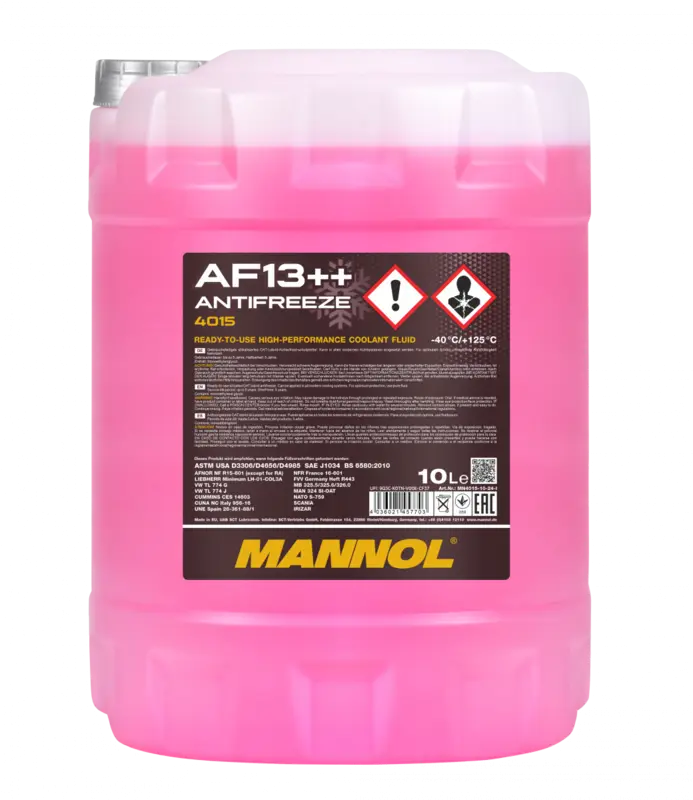 MANNOL Antigel AF13++ (-40 °C) PERFORMANȚĂ ÎNALTĂ 4015 Low-hybrid (LOBRID) Antigel ecologic de ultimă generație, de înaltă tehnologie, gata de utilizare (nu necesită diluare și protejează sistemul de răcire al vehiculului până la -40 °C), cu caracteristici excelente de funcționare, concepută pentru utilizare pe tot parcursul anului în orice sistem de răcire modern pentru care se recomandă utilizarea antigelului pe bază de monoetilenglicol. Asigură o protecție fiabilă a oricărui sistem de răcire. Proprietățile produsului: - Asigură o protecție excelentă a metalelor și aliajelor (alamă, cupru, oțel tratat cu aliaj, fontă, aluminiu) împotriva tuturor formelor de coroziune, precum și previne coroziunea la temperaturi ridicate a suprafețelor de aluminiu ale motoarelor moderne; - Pachetul de aditivi neorganici protejează imediat suprafața, iar partea organică începe să acționeze numai atunci când apar surse de coroziune, astfel încât se atinge o protecție maximă de la începutul utilizării, iar durata de viață a motorului este extinsă; - Are o stabilitate termică excepțională. Protejează împotriva formării depunerilor; - Are proprietăți excelente de conductivitate termică și rezistență la formarea spumei; - Este neutru față de inserții și furtunuri, compatibil cu toate tipurile de piese din cauciuc și plastic ale sistemului de răcire; - Are o rezistență excelentă la apa dură și rate foarte scăzute de epuizare a inhibitorilor de coroziune; - Pachetul de aditivi de înaltă eficiență asigură o stabilitate excepțională a proprietăților de funcționare ale antigelului pe întreaga durată de viață; - Este un lichid cu conținut scăzut de silicați. Nu conține nitrați, fosfați și amine (tehnologia fără NAP și OAT – Tehnologia Acidului Organic); - Pachetul echilibrat de aditivi permite extinderea maximă a duratei de viață a soluției. - Depășește cerințele standardelor internaționale și ale majorității producătorilor auto europeni. Este recomandat pentru motoarele autoturismelor și motoarele vehiculelor comerciale moderne. Pentru a obține cele mai bune calități, nu diluați soluția! Culoare: roșu. Durata de viață: nu mai puțin de 5 ani. Respectați instrucțiunile producătorului furnizate în manualul de utilizare!