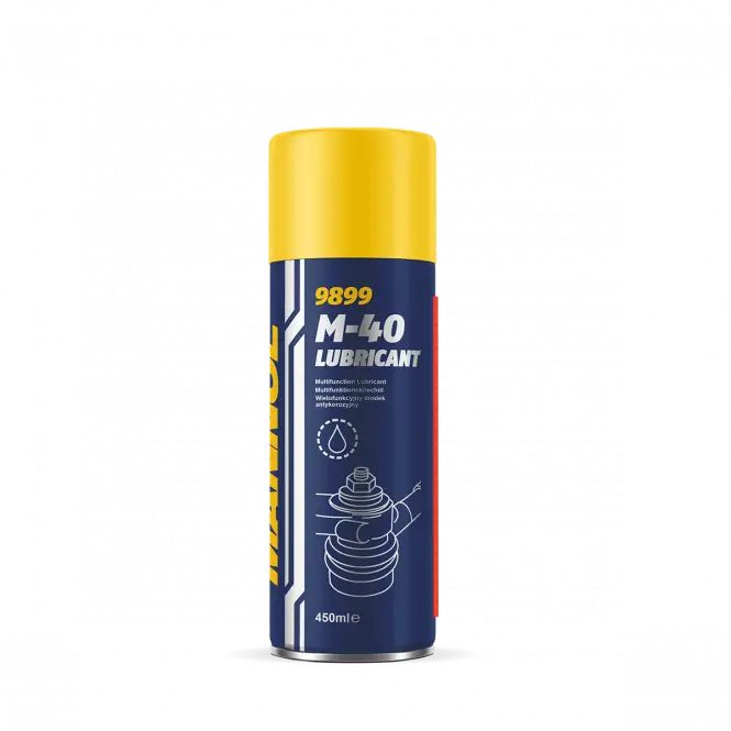 Spray Lubrifiant Mannol M-40 Degripant 450ml - echivalent WD-40Lubrifiantul M-40 este un lubrifiant aerosol universal (penetrant, de curățare, anticoroziv, anti-umiditate, anti-scârțâit etc.). Are proprietăți unice de lubrifiere și protecție și are o gamă largă de aplicații. Ideal pentru uz profesional și casnic. Este un amestec extrem de eficient de solvenți și uleiuri activi cu penetrare rapidă. Proprietăți: - Îndepărtează sucurile de legume, rășinile, adezivii, autocolantele, etichetele și benzile adezive de pe suprafețe fără a deteriora straturile de vopsea; - Potrivit pentru îndepărtarea urmelor de insecte de pe mașină, poate îndepărta guma de mestecat de pe covor. Exemplu de utilizare: