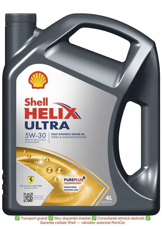 Ulei Shell Helix Ultra 5W30 RN0700 – Protecție Premium pentru Motoare Fără DPF Shell Helix Ultra 5W-30 este un ulei de motor complet sintetic, creat cu tehnologia Shell PurePlus, oferind o curățenie excepțională a motorului și performanțe de top pentru motoare pe benzină și diesel fără filtru de particule. Este aprobat de Renault pentru specificația RN0700, fiind ideal pentru motoare europene de generație modernă. Aplicații Recomandate ✔️ Motoare pe benzină și diesel fără filtru de particule (DPF). ✔️ Vehicule Renault care necesită specificația RN0700. ✔️ Utilizare urbană, extraurbană sau în regim de sarcină crescută. Proprietăți și Beneficii ✅ Curățenie avansată a motorului: Tehnologia Active Cleansing previne depunerile și menține motorul curat. ✅ Economie de combustibil: Formularea cu frecare redusă contribuie la o eficiență crescută a consumului. ✅ Protecție eficientă împotriva uzurii: Lubrifiere stabilă la temperaturi ridicate și porniri la rece. ✅ Stabilitate termică excelentă: Ideal pentru intervale de schimb extinse și regimuri solicitante. Specificații și Aprobări Specificații: ✔️ ACEA A3/B3, A3/B4 ✔️ API SN/CF Aprobări ale producătorilor: ✔️ Renault RN0700, RN0710 ✔️ MB 229.5, 226.5 ✔️ VW 502.00 / 505.00 ✔️ BMW Longlife-01 Specificații Tehnice Clasa de vâscozitate SAE: 5W-30 Vâscozitate cinematică la 40°C: 64,5 mm²/s Vâscozitate cinematică la 100°C: 11,8 mm²/s Indice de vâscozitate: 165 Punct de curgere: -45°C Punct de aprindere: 235°C Densitate la 15°C: 0,850 g/cm³ Cenușă sulfatată: 1,0% masă Număr total de bază (TBN): 10,0 mg KOH/g Instrucțiuni de Utilizare Verificați întotdeauna manualul producătorului pentru a confirma compatibilitatea. Se recomandă respectarea intervalelor de schimb pentru a menține performanțele maxime ale motorului. Depozitați produsul într-un loc răcoros, ferit de îngheț și lumina directă. Fișă Tehnică Pentru detalii suplimentare, accesați fișa tehnică oficială Shell Helix Ultra 5W30: Descărcați fișa tehnică. Beneficii Suplimentare ✔ Transport Gratuit: Disponibil pentru comenzi de peste 280 lei fără TVA. ✔ Discount pentru Cantități Mari: Reduceri speciale pentru achiziții en-gros. ✔ Calitate Garantată: Produse originale Shell, conforme cu standardele internaționale. Produse Similare Ulei Shell Helix HX8 5W30 1L Ulei Shell Helix Ultra Pro AVL 0W20 VW Ulei Shell Helix Ultra Pro AVL 5W30 1LAmbalaj: 4L